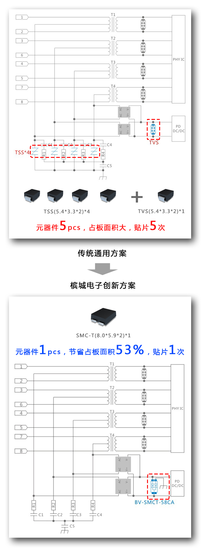 該優(yōu)化方案適用于所有有POE浪涌防護(hù)需求的設(shè)備,防護(hù)等級(jí)對(duì)應(yīng)方案向下兼容。方案具有使用簡(jiǎn)單,殘壓低,占板空間小、高性價(jià)比等特點(diǎn)。單顆集成的BV-SMCT-58CA功率大,余量足且體積非常小,響應(yīng)速度快,大大提升防護(hù)效率。