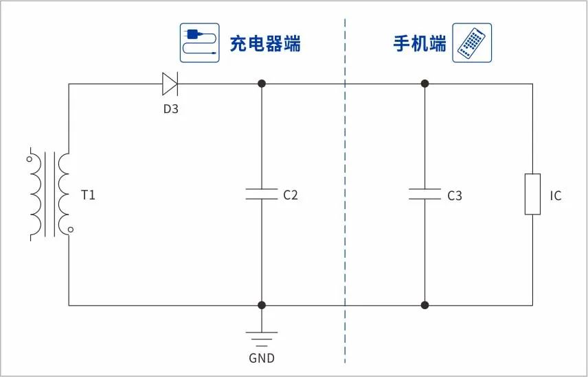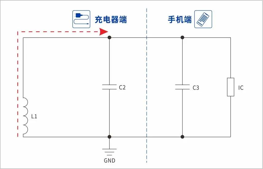 如上圖,總會存在一些斷開充電的瞬間,漏感L1給C2、C3充電,除此之外,充電端到手機端整個充電回路其實也有電感存在。總之我們都可以把他看著是L1 。