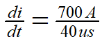以浪涌1.2/50us-8/20μs 2Ω,6KV 3KA浪涌測試標準為例。假設(shè)MOV殘壓在150V,TVS殘壓期望控制在90V(圖2),TVS的IPP 只有700A。假設(shè),鉗位電壓的脈沖寬度40μs(實測),電感的電流變化40μs內(nèi)應(yīng)該小于700A,,電感的電流變化率應(yīng)該小于17.5A/μs(圖3)。
