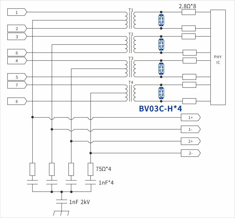 根據(jù)測(cè)試要求,對(duì)于外部的網(wǎng)口,最大能量為共模 6kV 7Ω的測(cè)試要求,電流大約為850A,能量相對(duì)較大,需要多個(gè)器件共同承擔(dān);根據(jù)標(biāo)準(zhǔn)的要求,測(cè)試完后需要滿足DC500V大于2MΩ的絕緣阻抗要求。