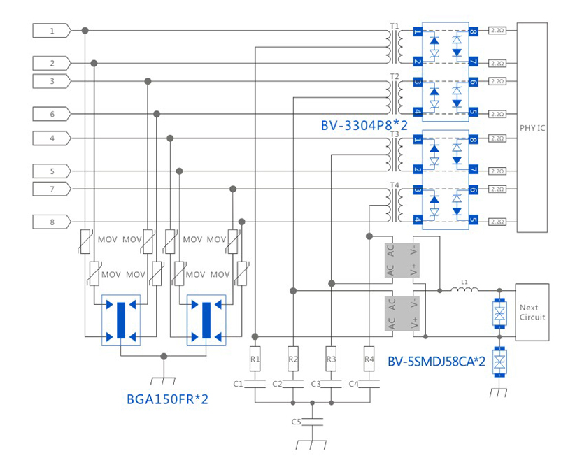 RJ45POE 10/700μs CM/DM 4KV-100A