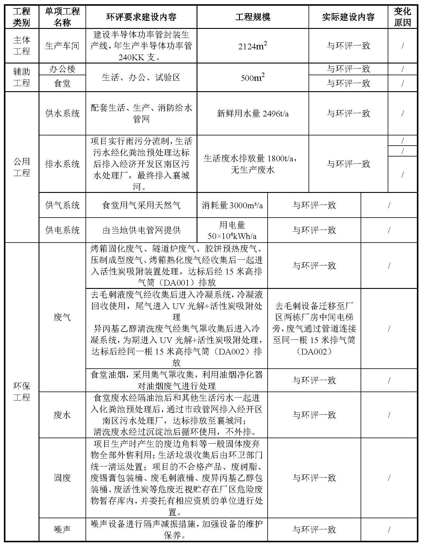 本項(xiàng)目營(yíng)運(yùn)期封裝生產(chǎn)半導(dǎo)體功率管過程中,其烤箱固化廢氣、隧道爐廢氣、膠餅預(yù)熱廢氣、壓制成型廢氣、烤箱熟化廢氣,主要污染物為VOCs。廠區(qū)內(nèi)設(shè)置了一套活性炭吸附裝置進(jìn)行處理,處理后經(jīng)15米高排氣筒(DA001)達(dá)標(biāo)排放。去毛刺液廢氣、異丙基乙醇清洗廢氣主要污染物為VOCs,各自采用冷凝+UV光解+活性炭吸附裝置處理后,處理后經(jīng)一根15m排氣筒(DA002)達(dá)標(biāo)排放。食堂油煙先由集氣罩收集,后利用油煙凈化器對(duì)油煙進(jìn)行處理后排放。