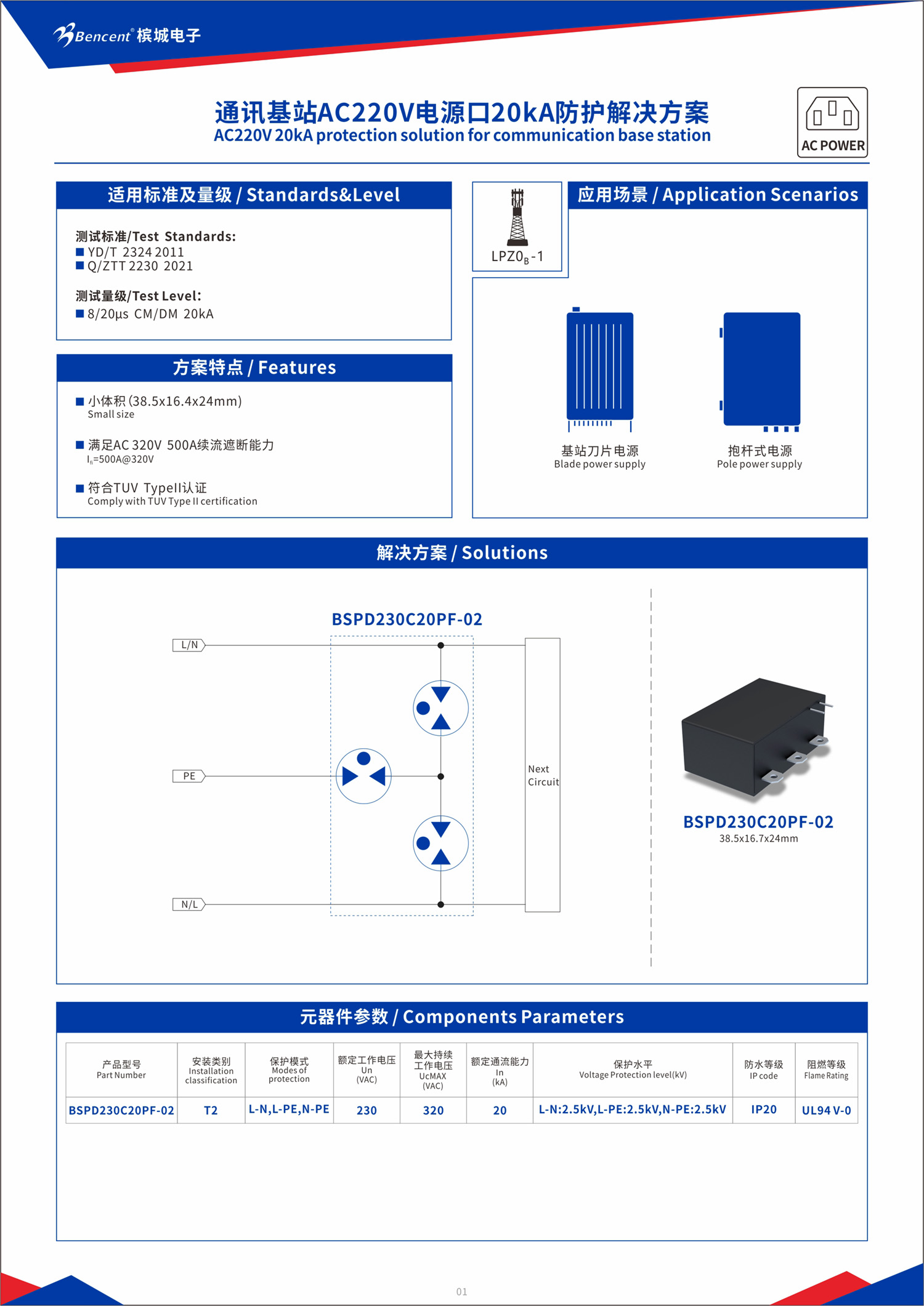針對電網的異常干擾,我們提供了高通流密度的防雷模塊BSPD230C20PF02